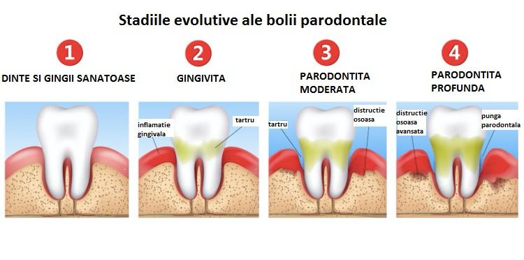 Bolile parodontale sunt cauzate de acumularea plăcii bacteriene și a tartrului, care duc la inflamația gingiilor și distrugerea structurilor de susținere a dinților. Cele mai frecvente afecțiuni sunt: